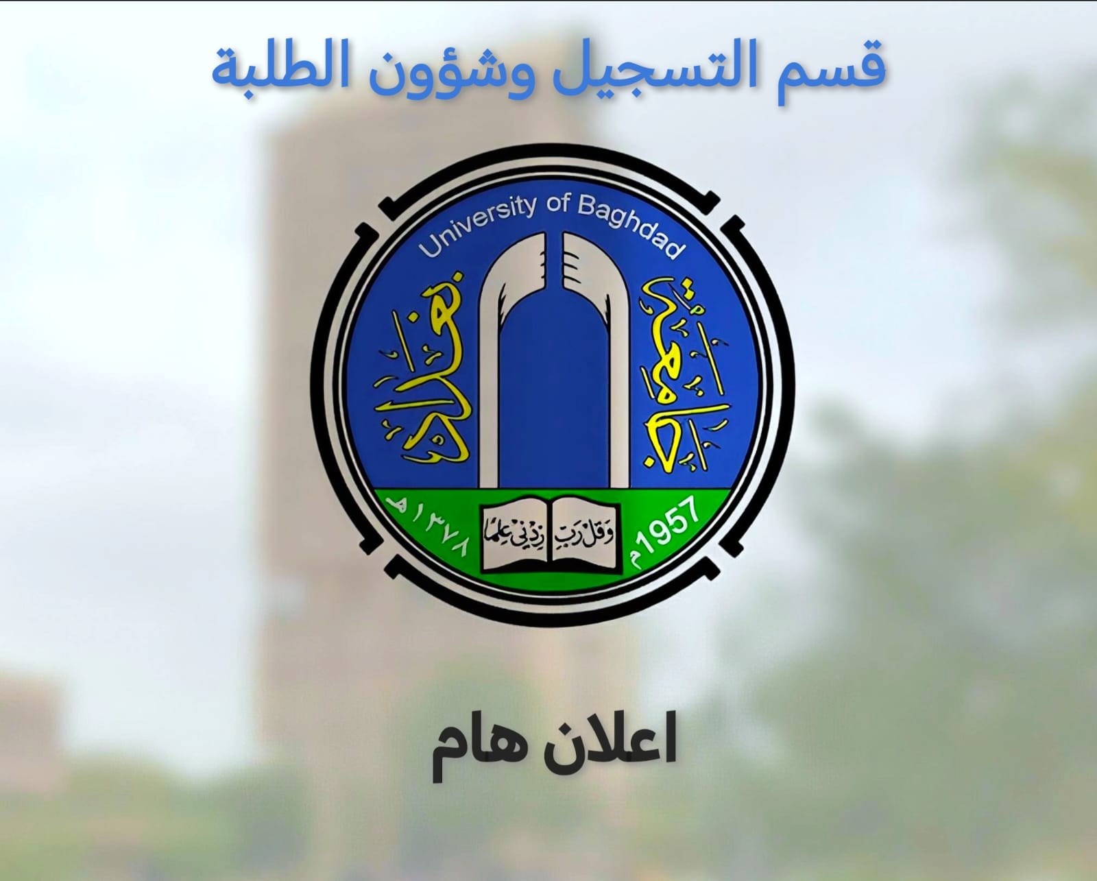 اعلان … فتح الاعتراضات للدراسة المسائية ويكون من خريجي الفرع العلمي والادبي فقط والذين ( لم يظهر قبول من المتقدمين فقط لغرض تعديل الخيارات وفق الحدود الدنيا) ويكون التقديم ورقيا في قسم التسجيل وشؤون حصرا الكائن في مجمع جامعة بغداد في الجادرية وللايام الأحد والاثنين الموافق ١٦ – ١٧ /١١
